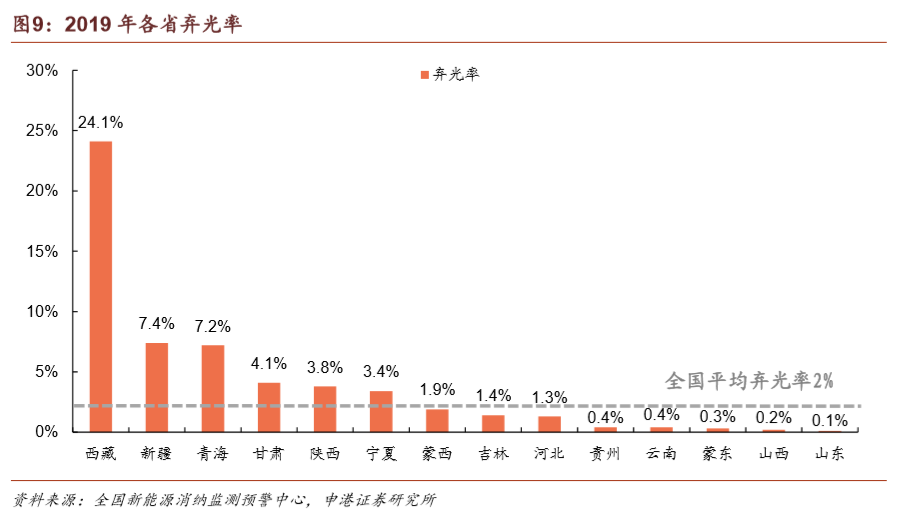 2019年我國棄風(fēng)、棄光率實(shí)現(xiàn)雙降,消納形勢繼續(xù)改善。全國平均棄光率為2%,同比下降1 pct。棄光率高于全國平均水平的省份有西藏(24.1%)、新疆(7.4%)、青海(7.2%)、甘肅(4.1%)、陜西(3.8%)、寧夏(3.4%),集中在我國西北地區(qū)。同期全國平均棄風(fēng)率為4%,同比下降3 pct。棄風(fēng)率高于全國平均水平的省份/地區(qū)有新疆(14%)、蒙西(9%)、甘肅(7.6%)、河北(4.8%
