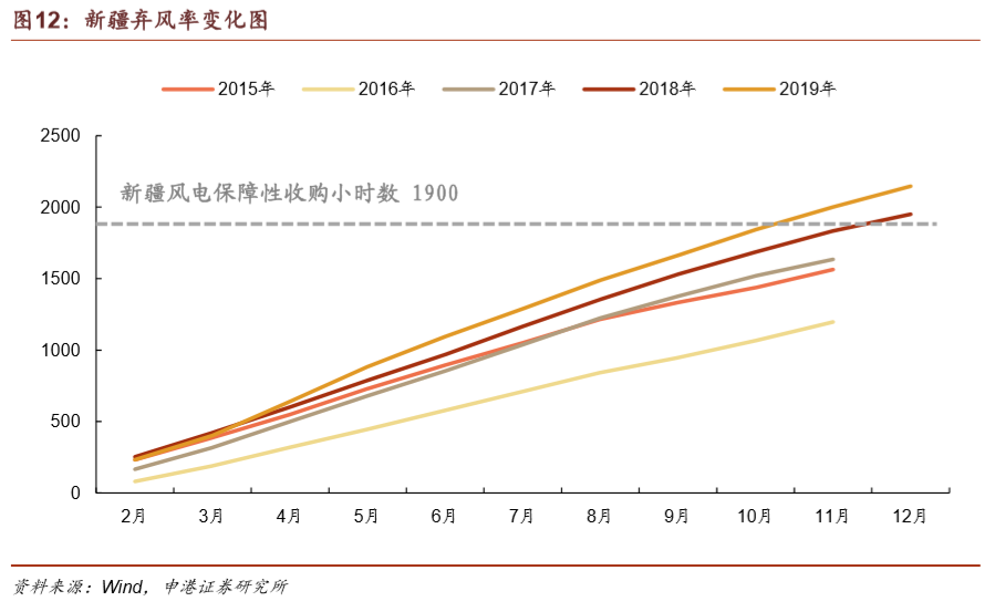 新疆有望于2020年脫離紅色區(qū)域,釋放風(fēng)電裝機(jī)需求。2019年新疆棄風(fēng)電量棄風(fēng)率14%,同比下降了9 pct,全年實(shí)現(xiàn)利用小時(shí)數(shù)2147小時(shí),高于最低保障性收購小時(shí)數(shù)1900,因此2020年新疆有望退出紅色預(yù)警區(qū)域,釋放新增裝機(jī)需求。而甘肅雖然2019年棄風(fēng)率只有7.6%,但全年利用小時(shí)數(shù)1787小時(shí),低于最低保障性小時(shí)數(shù)1800小時(shí)的要求,預(yù)計(jì)仍將位列紅色預(yù)警區(qū)域,不能進(jìn)行風(fēng)電項(xiàng)目建設(shè)。